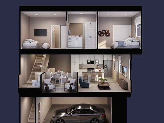 Well-styled contemporary luxe. Plan 2 (Towns) has a welcoming foyer, flowing up the inviting stairs to the spacious great room, casual dining area, and desirable covered deck. The well-designed gourmet kitchen is highlighted by a center island with breakfast bar, plenty of counter and cabinet space, and sizable pantry. The serene primary bedroom suite is enhanced by an ample walk-in closet and spa-like primary bath with luxe shower and private water closet. Secondary bedrooms feature roomy closets and shared hall bath. Additional highlights include a convenient second level powder room, centrally located third level laundry, and additional storage.