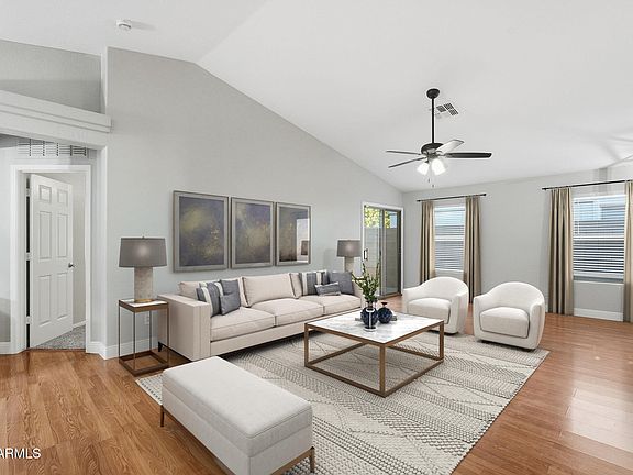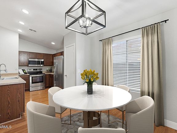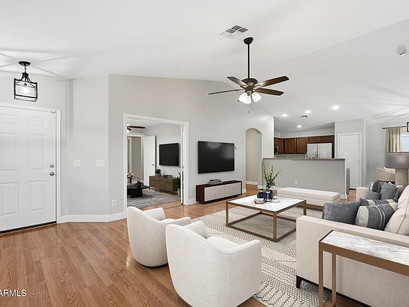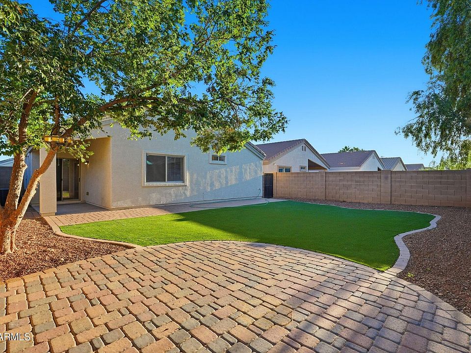 NO AGE RESTRICTION- PEORIA SCHOOLS! Welcome home to this charming 3 bedroom + office, 2 bathroom home, complete with a turf and paver backyard!, located in the highly desirable community of Dos Rios. You will love the Whirlpool stainless steel appliances, counter space and open concept kitchen. The primary bedroom includes dual sinks and a large walk in closet. Home features an oversized backyard including a covered patio, side yard gate, turf, and a fenced yard! New carpet, paint, fixtures and toilets in 2025. unique DECREASING PAYMENT Solar lease on this home provides energy savings.