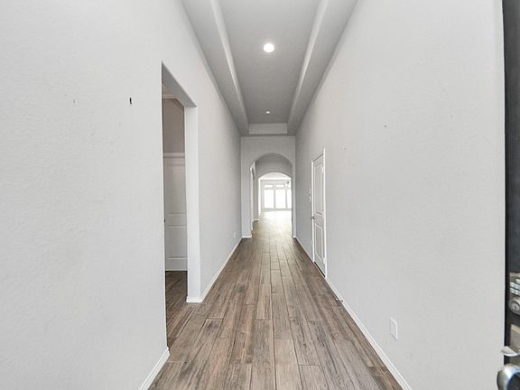 Stunning 2019 Perry Home offering an inviting entry and extended hallway with soaring 12-foot ceilings. A formal dining room and a private game room with French doors provide flexible living and entertaining spaces. The open-concept family room features a wall of windows and ceramic tile flooring, flowing seamlessly into the kitchen and breakfast area. The kitchen boasts a large island with counter-height seating.
