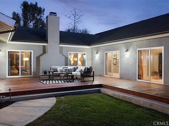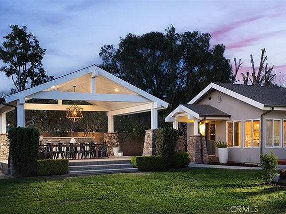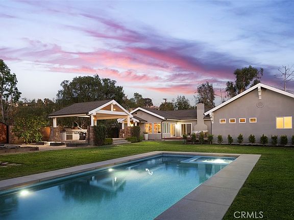 MODERN FARMHOUSE STYLE * SINGLE LEVEL HOME ON 0.6 ACRES * REMODELED * FULLY OWNED SOLAR PANELS * POOL & JACUZZI * GARDEN…Discover this exquisite single-level Modern Farmhouse designed home in the heart of North Tustin, beautifully remodeled in with classic style with high end updates throughout. Spanning 2,648 SF, this 4-bedroom, 2.5-bath retreat near top-rated Red Hill Elementary offers Kahrs solid plank wood floors, an open layout, and a striking exposed beam ceiling in the living/great room. Designed by C.R. Carney Architects, the home was rebuilt in 2005 and recently renovated by the current owner, it sits on a 0.6-acre lot with lush, drought-tolerant landscaping, mature trees, and a DG pathway. The gourmet kitchen features a walnut island, farmhouse sink, granite counters, shaker cabinetry, and beautiful windows showcasing the expansive backyard. Enjoy custom closets, window treatments, and a wraparound deck for seamless indoor-outdoor living. The backyard oasis was remodeled to include a salt-cell pool and jacuzzi with a Pebble tec finish, a raised garden, and an outdoor pavilion with a Lynx BBQ w/ countertop range, and a spacious dining area under a vaulted covered roof. Fruit trees surrounding this home include avocado, citrus, plum, peach, apple, persimmon, and fig trees. Additional highlights: copper plumbing, a 200-amp panel, two tankless water heaters, two AC condensers for dual zoned system and a fully owned Enphase 21-panel solar system. The garage was fully renovated to maximize storage and functionality, featuring a secure storage room and standing cabinets for additional organization. This centrally located North Tustin gem blends modern ease with farmhouse charm—ready for you to call home!