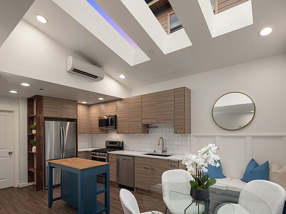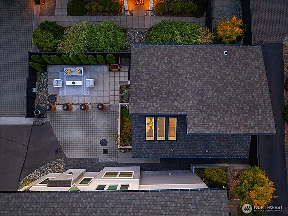 Distinctive urban design highlights standalone cottage in quiet Broadview. Inside, skylights + expansive windows flood space with natural light, illuminating refined finishes. Vaulted ceilings add dramatic touch. Thoughtful open-concept layout is ideal for entertaining guests. Striking kitchen design with attractive cabinetry, stainless appliances, subway tile, walk-in pantry. Main level includes guest bedroom + full bath with washer/dryer. Bright bonus space upstairs could be den or home office. Primary bedroom suite with walk-in closet. Fenced courtyard patio offers relaxing space for unwinding. Off-street parking in front of home for convenience. Near Carkeek Park + commuter routes.