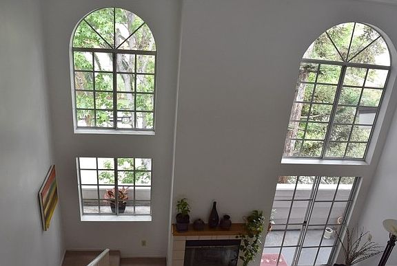 Lovely top floor unit with towering Cathedral Ceilings and huge gothic windows in LR. Nice galley KIT with room for breakfast bar, dining area. Master suite with two large closets with mirrored sliders, soaking tub in full bath. Additional large bedroom with adjacent to hallway full bath, and stackable washer/dryer hookups. Upstairs is a loft area with closet, perfect for office or additional bedroom. Two side by side parking spaces with storage bins in the subterranean garage.