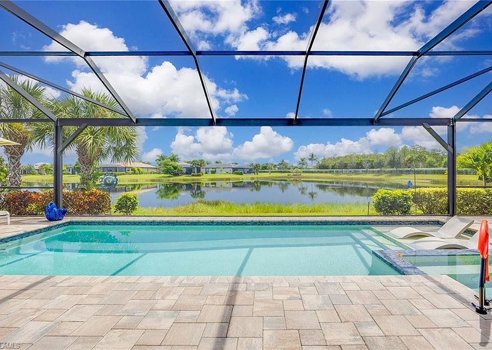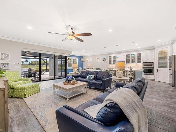 Positioned at the end of a quiet cul-de-sac in the desirable Bridgetown community at The Plantation, this beautifully appointed Pinnacle model offers a rare blend of thoughtful design, premium upgrades and warm coastal character. With three bedrooms plus a den and three full bathrooms, this residence features a spacious and functional split floor plan enhanced by soaring 10-foot ceilings, 8-foot doors, and high-end tile flooring throughout. The open-concept great room flows into a gourmet kitchen with upgraded cabinetry, quartz countertops, a large center island, walk-in pantry and a wine cooler, designed for everyday comfort and effortless entertaining. The den is thoughtfully outfitted with upgraded built-in cabinetry, making it an ideal home office or study. The luxurious primary suite offers generous space and privacy, while the guest bedrooms are separated for ideal functionality. Quartz countertops extend into the baths, unifying the elegant finishes throughout This home is being sold fully furnished and professionally decorated in warm, coastal-inspired tones and textures—ready to welcome its next owner in comfort and style. The home’s signature corner sliding glass doors provide a seamless transition to outdoor living, opening to an expansive picture window lanai with storm shade, eastern exposure and tranquil pond views. The backyard oasis includes a custom outdoor kitchen, a heated saltwater pool with spa and sun shelf, and a Pentair automated pool system for effortless control and maintenance. Additional highlights include a three-car air conditioned garage with a 4-foot extension, built-in shelving, and motorized overhead storage to accommodate all your organizational needs. Enjoy peace of mind with impact glass doors and windows, a tankless water heater, reverse osmosis water purification system in the kitchen and water softener throughout the home. Bridgetown is one of Fort Myers vibrant and amenity-rich communities, offering residents an active and social lifestyle. The community features an expansive and recently updated fitness center, temperature-controlled resort-style and lap pools with both chillers and heaters, and a wide array of recreational opportunities including competitive pickleball, tennis and bocce ball programs. Residents enjoy access to a spacious clubhouse, scenic walking paths, and a robust calendar of events that fosters a welcoming neighborhood spirit. Ideally just minutes from Gulf Coast Town Center, Florida Gulf Coast University, and a variety of top restaurants and retail destinations, Bridgetown also offers easy access to Interstate 75 and is less than 15 minutes from Southwest Florida International Airport. Whether you're looking for a furnished seasonal escape, a full-time residence or a second home with refined finishes and showstopping outdoor space, this exceptional Pinnacle model offers an unmatched blend of luxury, comfort and community.