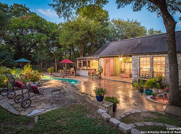 Texas Hill Country with a modern flair...on 7.8 acres for privacy, 4 bedrooms 2 bathrooms and numerous upgrades making it a stunning hidden jewel. The backyard is set to entertain and relax with an exquisite pool and outdoor BBQ/Outdoor kitchen area. The Kitchen includes butcher block island, custom white cabinetry with tile accent back splash, high end appliance including a wine fridge and stainless steel farmers sink. The interior lighting fixtures are upgraded and really accent the modern feeling.
