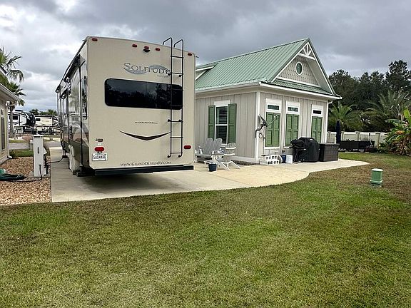 Living in paradise is all you imagined it would be at Lake Osprey RV Resort & Country Club located in coastal Alabama! This captivating coach home offer the perfect balance between an RVing lifestyle and simply living in a beautiful southern neighborhood. Ownership is deeded, with an HOA. You may live full-time, or as a part-time vacation home, and you may rent your RV pad through a rental program if so desired as investment income. This house is in a highly desirable location near the clubhouse and hub of activities. This home's driveway is a full 75' RV pad complete with utility hookups. Its' gorgeous design showcases front entry French doors and interior plantation blinds throughout the home. Meticulous detail and decorative upgrades make this house so special! Extra high ceilings highlighting a wood beam feature creates the perfect airy and light living space. All hallway, doors, and bathroom features are handicapped accessible, sliding white barn style doors with brushed nickel hardware, and walk-in shower. Easy access to attic for spacious storage. Being part of Lake Osprey means you are part of neighborhood revolving around a luxury RVing culture. However, you are not required to have an RV to live here! As a resort community, HOA monthly dues of $320 includes your water, trash pick-up, sewer, internet, cable TV and lawncare. Plus, the common areas include a large clubhouse, with many recreational amenities. Enjoy the infinity pool, hot tub, fitness center, putting green, pickleball courts, dog park tiki bar and more! a short drive to the beaches, shopping, amusement parks, the location of Lake Osprey is optimal for both permanent or vacation living! Resort accepts Class A, Class C & 5th wheels - age and length requirements apply.
