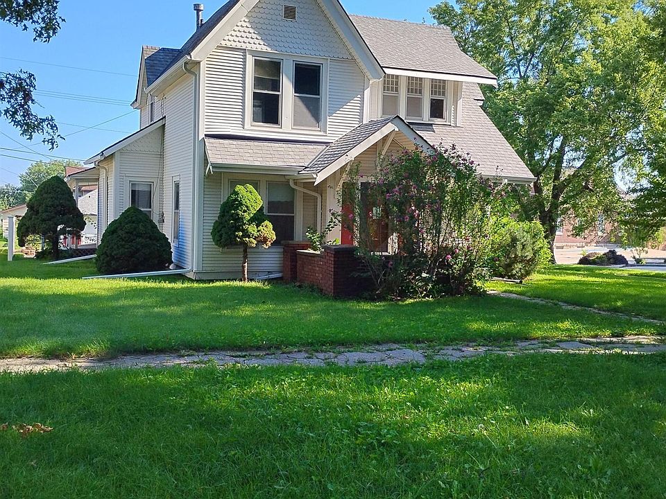 Opportunity awaits with this 4-bedroom, 1.5 story home filled with classic charm. It features beautiful woodwork, two brick fireplaces, a spacious living room, dining area, and main-floor laundry for added convenience. Stunning corner lot with mature trees. 1-car detached garage. Maintenance-free siding and cozy covered porch. This fixer-upper is ready for your personal touch. This property is being sold as-is. All measurements are approximate. Sq Ft per county.