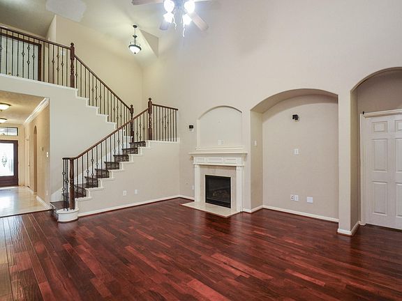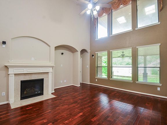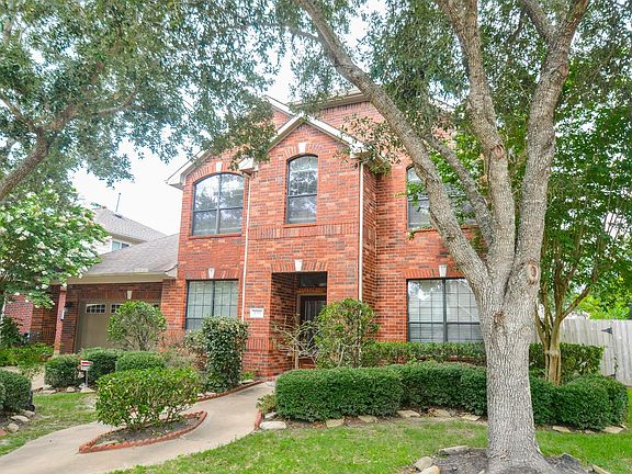 FACES EAST Located in Sugar Land's sought-after Telfair community, this two-story brick home blends timeless charm with modern comfort. Inside, wood floors, soaring ceilings, and abundant natural light create an inviting atmosphere. The foyer opens to a formal dining room and a versatile space ideal for an office or den. The living area features dramatic two-story windows, a fireplace with custom niches, and open flow into the kitchen and breakfast nook. The kitchen offers ample cabinetry, generous counters, and a raised bar overlooking the living space. A private downstairs suite provides a quiet retreat with views of the backyard. Upstairs includes a spacious game room and additional bedrooms, offering flexibility for daily life. Outdoor living shines with a covered patio and a skylit balcony overlooking a lush, fully fenced yard. Enjoy nearby lakes, trails, and a resort-style pool in one of Sugar Land's most vibrant neighborhoods.