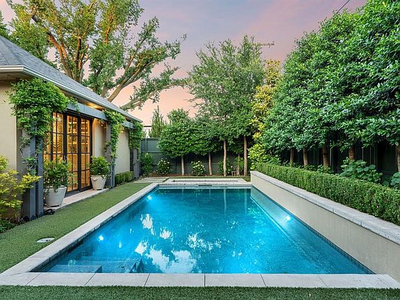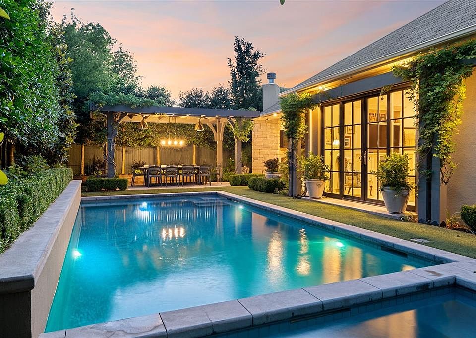 Immerse yourself in the essence of casual summer living with this inviting stucco-finished home. Durable hardwood floors lead to a welcoming sitting room with a cozy double-sided fireplace perfect for relaxed gatherings. Adjacent is a spacious dining room, ideal for leisurely meals and entertaining guests with a discreet full bar area nearby for effortless hosting. The bright, airy living room seamlessly connects to the kitchen and breakfast nook, creating an open, inviting space. The kitchen boasts an updated marble island, sleek countertops, and modern stainless steel appliances. The primary suite is a true sanctuary with new carpet and tile, creating a serene atmosphere. The luxurious bathroom features a full-size steam shower and a jacuzzi tub, providing a spa-like experience at home. Ample closet space ensures plenty of storage, while Pella French doors lead outside, allowing natural light to fill the room. A remote-controlled shade adds convenient privacy. Step outside to discover a reimagined backyard oasis. The lush, easy-care landscaping surrounds a sport pool and hot tub, perfect for cooling off on warm summer days or relaxing in the evenings. A pergola combines outdoor living and dining areas, making it the ideal spot for entertaining or enjoying a quiet meal al fresco. Upstairs, you'll find three comfortable bedrooms, each with new carpet and updated en suite bathrooms, ensuring comfort and privacy for family and guests. A media room with ample storage space completes the upper level, providing a versatile space for entertainment or relaxation. This home blends casual comfort with modern style, offering a retreat-like atmosphere perfect for those who cherish a laid-back summer lifestyle. Thoughtfully designed, every detail creates a space where you can relax, entertain, and enjoy the best of summer living. Welcome to your summer sanctuary.