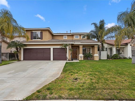 Cul-de-Sac home with a Pool. Beautiful stacked stone wall in entry/Living room area. Large Family room open to Kitchen New A/C system and water heater. New paint on first floor. Primary bedroom has tub & shower and large walk in closet with dual entrance. Den could easily be turned into 4th bedroom. Garage is fully drywalled with overhead storage racks, Cabinets/counter and extra room on the 3rd car side. Backyard is Low maintenance with Synthetic grass, several palm trees for that tropical feel while enjoying the pool. Centrally located off Upper Dr. Close to all of what Corona has to offer. Check out the 3D 360 Tour Link