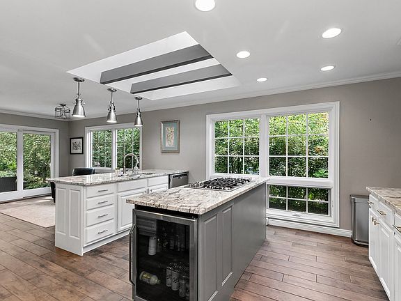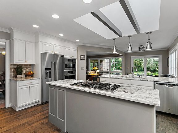 This beautifully renovated home is situated in one of Southwest Geneva's premier in-town locations, offering the ultimate convenience-just a short walk to grade school, the charming shops and fine dining on historic Third Street, the scenic river and bike trails, and the Metra Train station. The gourmet kitchen boasts granite countertops, high-end stainless steel appliances, including a Jen-Air range, Bosch built-in double ovens (convection & microwave), dual islands, and a built-in Bosch cappuccino machine at the coffee bar. The dinette leads to a brick-paved patio complete with a fireplace and firepit with a gas starter, surrounded by a stunningly landscaped, private, wooded yard that's both beautiful and low-maintenance. The master suite features a spacious 13x11 walk-in closet with custom built-ins, a luxurious heated whirlpool tub, a rain head shower, and a granite vanity with integrated sinks. The living room offers a cozy fireplace and a wall of custom windows overlooking the breathtaking yard. There's a den (or potential extra bedroom) with vaulted ceilings, a fireplace, and an atrium door that opens to the picturesque yard. The home also includes a formal dining room, a fully finished basement with recreation areas and an exercise room, and meticulously updated bathrooms throughout. With stunning millwork and an open floor plan perfect for flexible living, this home is truly move-in ready!