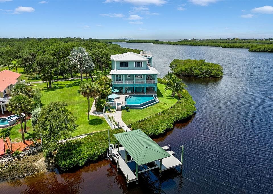 Caution!!! If you tour this spectacular, waterfront, Little Manatee River estate home, you will buy it! This amazing 3508+ sq ft 3 bedrooms, 3 bath contemporary home, with finished bonus space is situated on a .63 acre lot. With 311' of Little Manatee riverfront, every room, has a spectacular water view. Water lovers, bring your boat, jet skis, kayaks and paddleboards. Your new composite dock is equipped with a covered 9,000 lb boat lift, 1500 lb jet ski lift, and floating dock. After a day of boating in Tampa Bay, which is only a 400 yard boat trip from your dock, cool off in your 45’ infinity edge, salt water pool. Your paver driveway leads to your beautifully landscaped, elevated home, 20' above the river's edge. Current cost of wind and flood insurance is $5400 per year. Your oversized driveway can hold your RV, boat trailer, motorhome or any of your toys. The oversized, two car garage has room for your bikes, SUV, and is equipped with an EV level 2 charger. Ride the elevator to the main level and take in the breathtaking, river views through the towering hurricane rated, sliding doors and windows. The bright, sun filled, main floor with its open floor plan, has soaring 21' ceilings and hardwood floors. The main level hosts two bedrooms and two full baths. The chef-inspired kitchen includes stainless steel appliances, a commercial-sized refrigerator, gas stove, reverse osmosis water system, and granite countertops. A walk-in pantry tops off this gourmet kitchen. On the third floor you'll find a game room and the primary bedroom suite. The primary bedroom boasts a spectacular view of downtown St. Pete and a custom, walk-in closet. The primary bath includes dual sinks, a separate water closet, dual head rain shower, and jetted bathtub. The lower level has an additional living area, a pool bath, laundry hookups, and bar equipped with a refrigerator and dishwasher. Other amazing features: state of the art security system, landscape lighting, irrigation system, solar shades, stained glass front doors, mosaic glass backsplash, multi-zone A/C, tankless hot water heaters and d/c motor ceiling fans. This private slice of paradise is located at the end of a quiet dead-end street. No traffic, no noise, and most importantly…NO HOA, NO CDD fees. Two minutes to US 41, 10 minutes to I-75, 30 minutes to Tampa airport or downtown St. Pete, and only 10 minutes to the new Moffitt Cancer Center. HURRY!!!