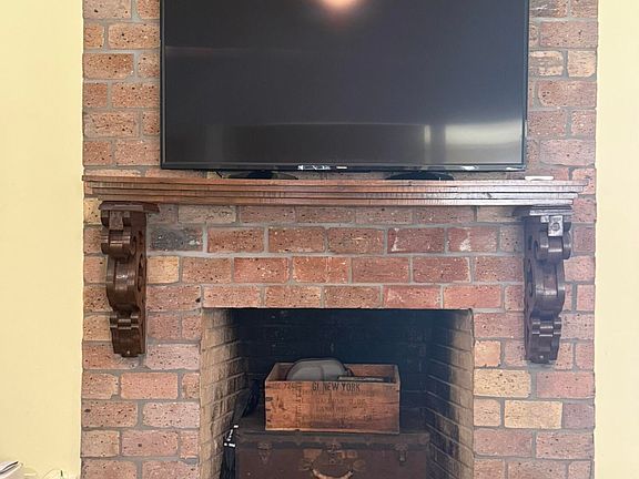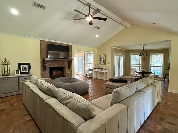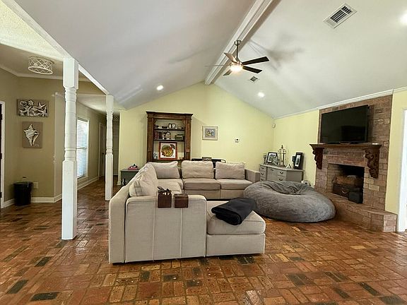 Step inside to a bright, open living area with soaring vaulted ceilings, exposed beams, and a beautiful brick fireplace that anchors the space. The large living room flows directly into the dining and kitchen areas, making it perfect for gatherings and everyday living. Durable brick flooring throughout the main living spaces adds warmth, charm, and a true coastal-southern feel.