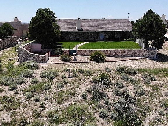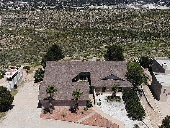 Spectacular views of the City of Carlsbad greet you through two huge east-facing windows. Walk closer to the windows and take in the beautiful, dark green lawn and a covered porch that runs the length of the house. The back yard fence is made of rock and stuccoed block, and mature pine trees line the north and south ends of the yard. A walled picnic area beyond the yard enclosure offers a secluded option for barbeques, picnics, or kicking back to watch incredible moonrises or gaze at a sky full of stars. The property ends about 300 yards down the hill into East Canyon, ensuring your view of the city and moonrise is protected.