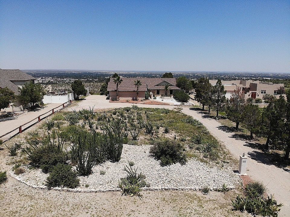 This single-family ranch-style home, constructed in 1996 on 2.5 acres on a hill above the City of Carlsbad, offers spectacular views of the city and is located in the sought-after Fountain Hills Subdivision. A long gravel driveway takes you from Miehls Drive a short distance through natural desertscape – a forest of ocotillo, prickly pear, and bird of paradise – to a beautifully landscaped front yard. Palm trees welcome you to a walkway lined with wildflowers leading to a quaint green gate, the entry to a magical courtyard, complete with fountain and more wildflowers.
