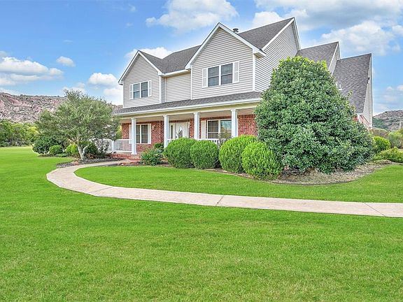 Sitting on approximately 4.7 acres this home has a country feel inside city limits. With 3,192 sq. ft there is plenty of room for you and your family to enjoy. The home has 4 bedrooms and 3 bathrooms with 2 rooms on the first floor and 2 more upstairs. An extended driveway leads up to a spacious 2 car garage that is connected to the home. This home features an open floor plan between the living area and kitchen with a separate dining space and checkered tile kitchen flooring that matches up to the living room carpet. Just off the kitchen area lies the primary bedroom large enough to hold a seating area and has an exit to the back outdoor patio. The ensuite bathroom boasts a large walk-in closet, tiled countertop vanity, stand-alone shower and a jacuzzi tub. Upstairs, a full bathroom lies between the two bedrooms and a balcony overlooks the living space. Out front, this home has a large wrap-around porch and a covered patio out back with beautiful views of the Granite mountains!
