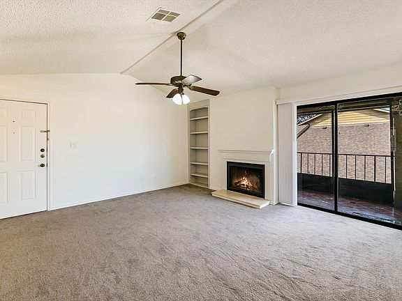 Move-in Ready! This top-level 1-bedroom, 1-bath condo is perfectly located less than five minutes from Texas State University and close to the San Marcos River, dining, and downtown. Inside, the open layout ties the kitchen, dining, and living together under vaulted ceilings, with a cozy fireplace for cool nights. A sliding door leads to the screened-in patio, where a handcrafted mural and vibrant Talavera tile accents add charm and color. The condo has been updated with modern finishes, including Caesarstone quartz in the kitchen and bath, stainless steel appliances, a breakfast bar, and extra cabinetry with a dry bar for storage and style. One assigned parking spot is included, and community amenities feature a pool and clubhouse for relaxing or studying. BEST OF ALL: renters only pay for electricity and internet, the owner covers water, sewer, and trash, making budgeting simple. Whether you're a student, university employee or anyone wanting a great condo in a perfect location, this condo is move-in ready and offers the ideal San Marcos lifestyle in a convenient, central location. Comes with assigned parking. Renter to verify all info. Photos virtually staged.