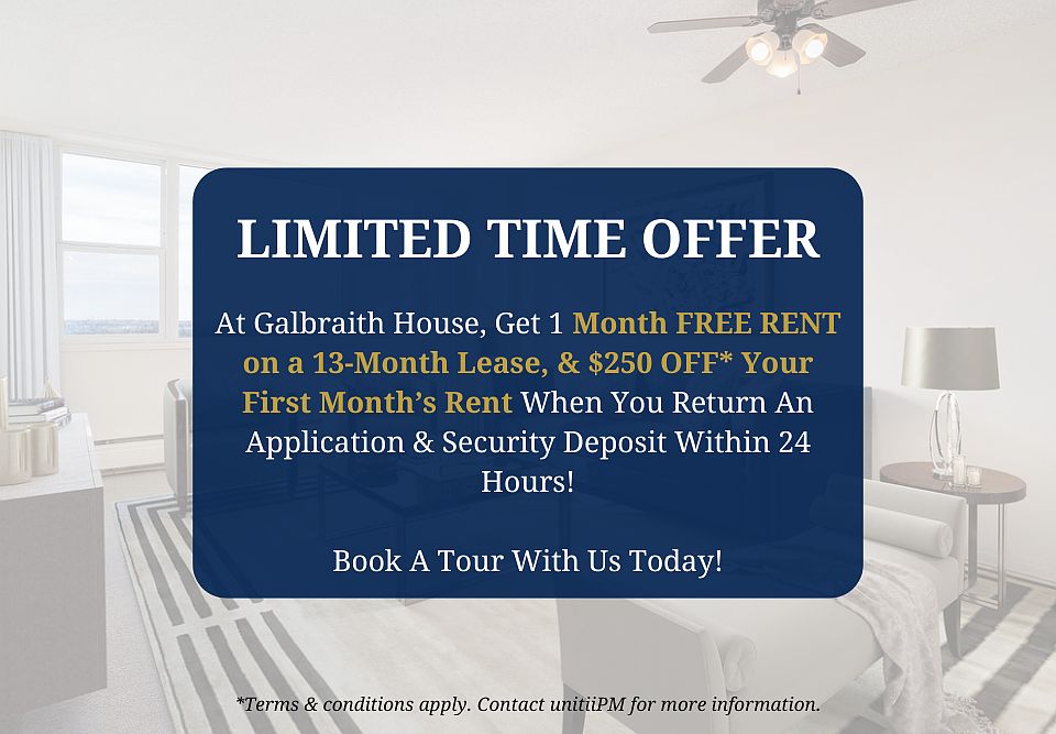 - Special offer! Get 1 Month FREE RENT & $250 OFF Your First Month's Rent! - At Galbraith House, Get 1 Month FREE RENT When You Sign a 13-Month Lease. Get $250 OFF* Your First Month's Rent When You Return An Application & Security Deposit Within 24 Hours! Book A Tour Today! *Terms & conditions apply. Contact unitiiPM for more details.