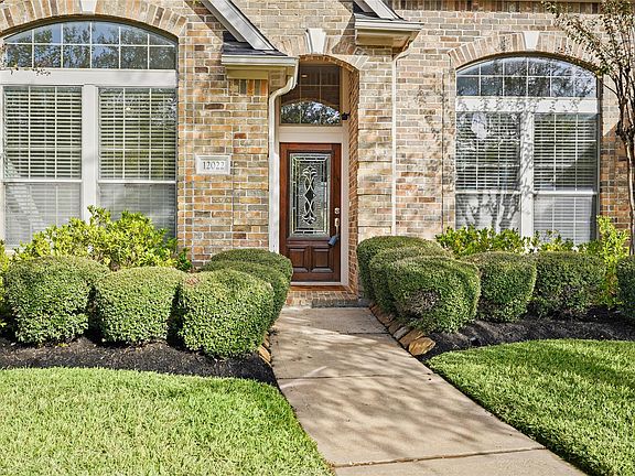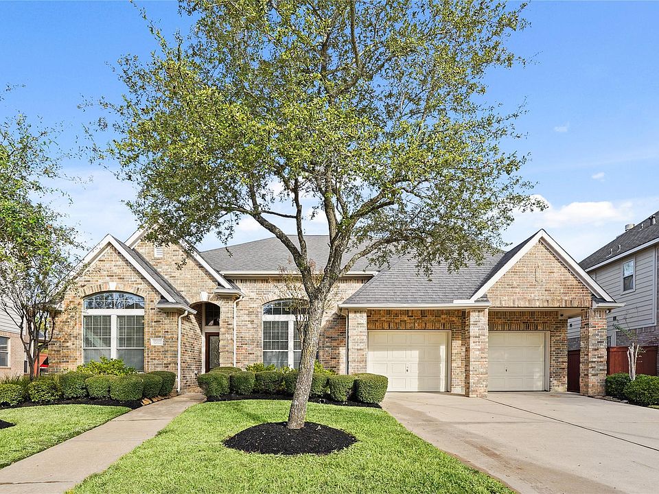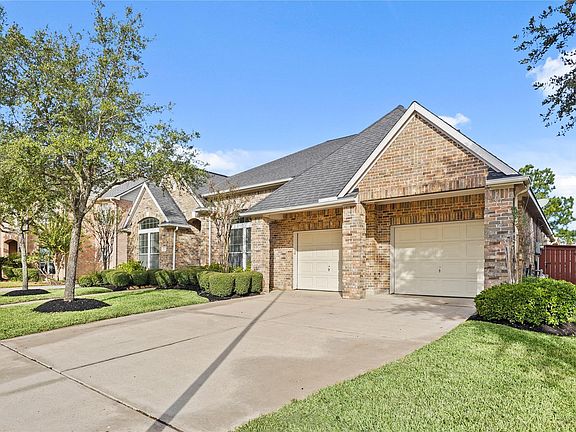 Magnificent 1 story Trendmaker home. 4 bedrooms and 1 study. Open floor plan w/gourmet granite adorned island kitchen, bump out stainless steel 5 burner cooktop, bump out sink and convection oven. Stove features downdraft ventilation. GE Profile stainless steel appliances. Walk in pantry. Hollywood bath between the 2nd and 3rd bedroom. Family room features built in ceiling speakers, surround sound wiring and entertainment built in shelves. Hardwood floors in the foyer, hallway, kitchen, breakfast and family room. Large master with crown molding. An exquisite spa bath, and large glass enclosed double shower, with two shower heads and body jet spray. His and hers granite vanities and California walk in closets. Roman arches throughout, pillars in the formal dining, skylight in the breakfast area, hi ceilings throughout, sprinkler system. 2 car garage, features Tesla charger mounted on wall. Water softener system. Lutron intelligent lighting control for exterior, garage, hallways, etc.