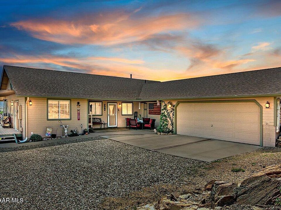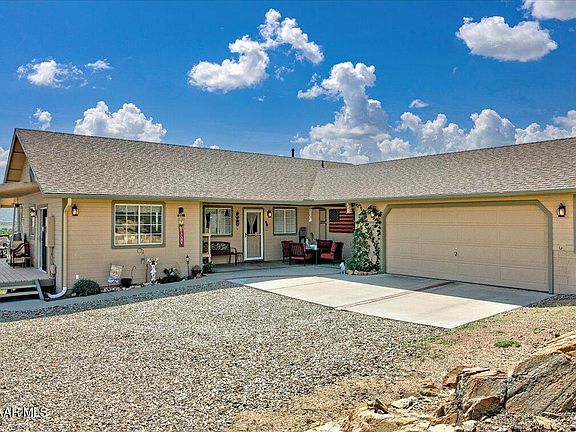 What goes best with panoramic views and 2.5 acres of land? How about a beautiful single level site-built home with new roof, new Trane AC, new hot water heater, recent interior and exterior paint, laminate flooring throughout, and an RV carport with electricity, water, and refuse disposal. Spacious great room with wood burning fireplace, pitched ceiling, custom light fixtures, and magnificent Mingus Mountain vistas to be appreciated inside or from the entertainment friendly wrap around deck. Large, family friendly kitchen and dining offers an abundance of counter and storage space, and all stainless newer appliances convey. Take in the long-distance scenery from the kitchen windows. Primary ensuite with deck access and bath with separate shower and garden tub plus large walk-in closet. Guest bedroom has direct access to full bath. So many outside spaces to relax, and, YES, chicken coop, green house, and shed all stay.