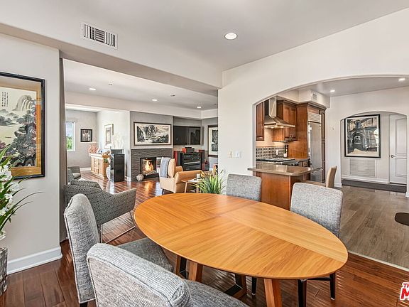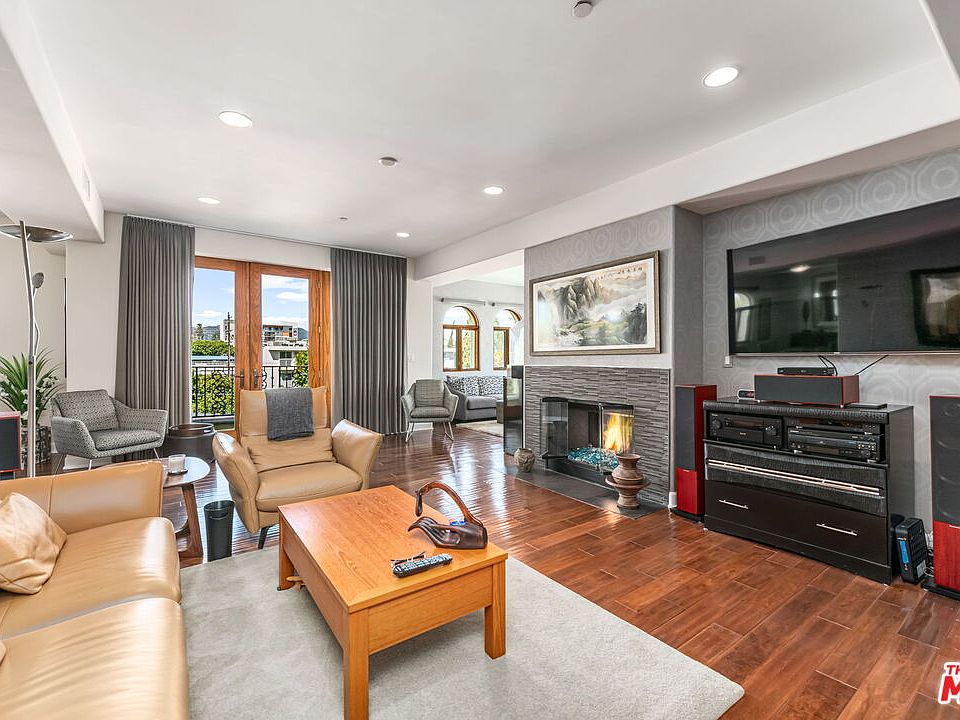 This exquisitely remodeled corner penthouse in a newer Mediterranean style building offers an unparalleled blend of refined elegance, comfort and sophistication, as well as gorgeous northeast facing views of city and skyline. This "developer's unit" boasts 3 bedrooms or 2 plus a den and 2.5 baths in approximately 1850 square feet all on one level. A gracious double door entry and expansive Anderson windows welcome you into an open and airy living space where high ceilings and rich wood floors create a peaceful, inviting ambience. A chic "designer perfect" powder room is tucked off the entry. Designed with both style and function in mind, the gourmet kitchen features top of the line Viking appliances and a Sub-zero fridge, Caesarstone countertops and custom cabinetry. The living and dining areas, enhanced by a custom designed stone fireplacethat adds warmth and character flow to a large front balcony. The serene primary suite offers a fireplace, luxe bath and generously sized walk-in closet. A spa like guest suite completes this wing of the unit. A spacious private rooftop deck with BBQ area offers breathtaking views, providing the perfect backdrop for entertaining or quiet relaxation. No expense was spared on the quality updates and finishes throughout which include imported wall coverings and Porcelanosa Spanish tile. Other highlights include recessed lighting, ample storage inside and out, secured side by side parking, plus guest parking, and low HOA dues. Ideally situated adjacent to Brentwood, Santa Monica and Westwood, this rare and special residence is truly a gem!