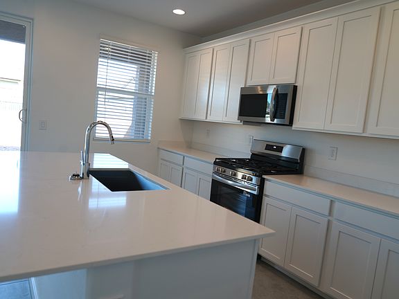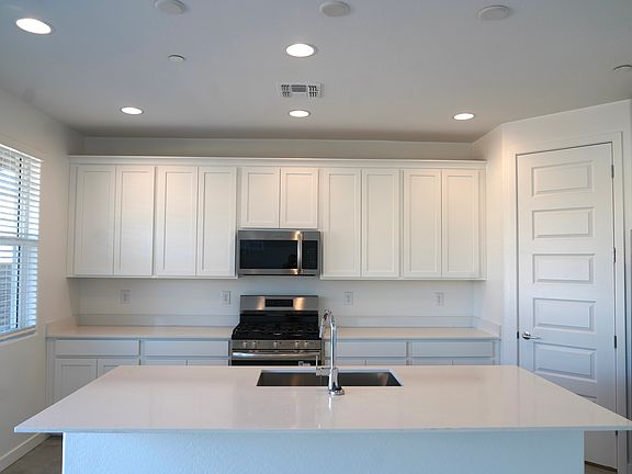Extended paver patioModern open-concept floor planBeautiful kitchenLow-maintenance turfLarge walk-in pantryWhite shaker cabinetsProfessionally landscaped backyard