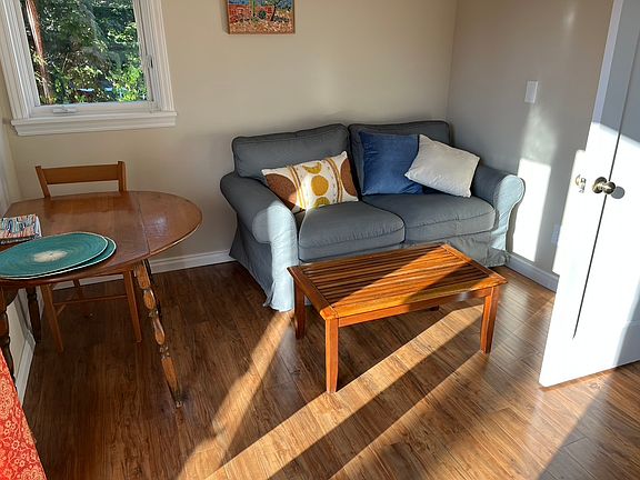 Lovely light 1 bedroom apartment with new kitchen and appliances including dishwasher and washer dryer in unit. French doors open onto deck overlooking back garden with west facing view//see photos. Parking in back and storage locker for bikes. Separate entrance via outside stairs. Currently unfurnished. Close to bus stops. All utilities included. One year lease minimum. No smoking. No pets