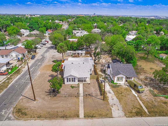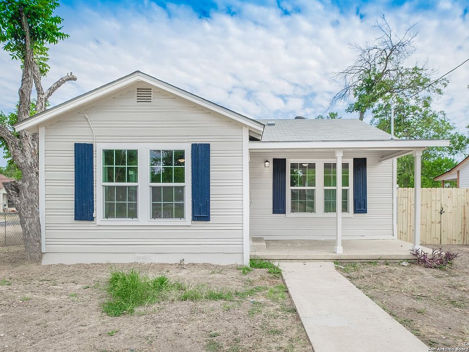 Newly renovated and move-in ready, this one-story home offers 1,768 sq ft of living space on a 0.17-acre corner lot. With 3 bedrooms, 2 bathrooms, and thoughtful updates throughout, this property blends comfort and functionality. A dedicated living room provides a separate gathering space for relaxation. The open kitchen and dining combo features a breakfast bar for extra seating, large windows that fill the space with natural light, and a layout perfect for both casual meals and entertaining. The primary suite is designed as a versatile retreat, with a spacious bedroom with a closet, an adjoining room that can serve as a home office, nursery, or sitting area, and an ensuite bathroom with a single vanity and shower. Two additional bedrooms share a full bath, while the large laundry room adds everyday convenience. Additional highlights include a roof that is only 7 years old, a front porch, a covered back patio, a wooden fenced backyard, a carport at the back with side-fence access and additional open parking spaces, and a large exterior storage building. Located just minutes from Hwy 90, you'll enjoy quick access to downtown San Antonio, shopping, and dining. This fully remodeled property combines modern updates, flexible spaces, and a convenient location, making it a wonderful place to call home.