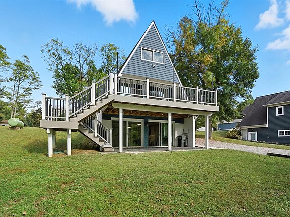 Lake front view! (2 Parcels = approx. .08 acre, nearly an acre). Ideally situated in Lake Lorelei. 204' of shore line. 2,400 sq ft living space total. Picturesque, panoramic setting for nature lovers. Attractive Lake A-frame/Chalet Architectural design. Lots of charm and character. *present owner invested approximately $200,000 in renovations & improvements including the following updates & upgrades: New roof, windows & doors, 8 sliding glass doors to enjoy the views, air conditioner, kitchen, flooring, lighting, composite decking, siding, driveway, painting and much much more. New Kitchen with granite countertops, new cabinetry and stainless steel appliance. Move in ready and available for occupancy at closing. Finished walk-out lower level with view of lake & master bedroom enjoys view of lake. *Seller says boat doc may be a possibility. Top level:2 bedrooms. Main level: family room, 3rd bed or office, full bath .LL Great rm, kit, bath, din. Truly a one-of-a-kind, hard to find home!