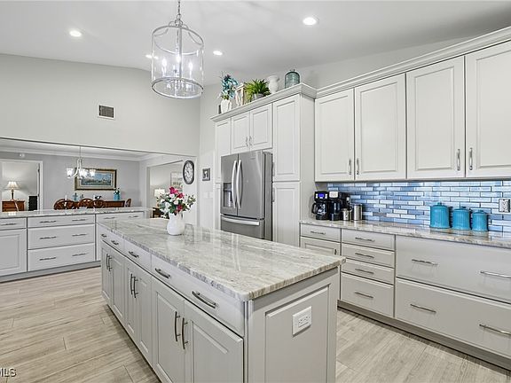 The spacious, absolutely gorgeous, open kitchen is a true highlight, featuring custom countertops and cabinetry, as well as stainless-steel appliances. Tile flooring flows throughout the home, enhancing the clean, modern feel. Relax or entertain on the screened lanai overlooking the golf course, where you can enjoy tranquil views year-round.