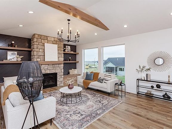 A must see! This beautiful walkout ranch boasts 3,321 SF of appealing living space nestled on a lovely lot in Grimes' desired Willow Hills! A unique front stone façade oozes curb appeal while an open floor plan with sprawling ceilings, oversized windows & striking trim details welcome you home! The large living room features a vaulted ceiling with wooden beams, cozy stone surround fireplace & custom built-ins with shiplap trim detail. Perfect for entertaining, the kitchen boasts a large center island, stainless appliances with a wall oven, gas cooktop & custom hood vent, quartz counters, soft-close cabinetry, under cab lighting & a walk-in pantry. An open dining area leads to an impressive covered & screened composite deck for comfortable outdoor living. An arched doorway leads to the spacious primary suite offering a double vanity, tile shower, soaker tub & large walk-in closet with upgraded shelving connected to the laundry & mudroom with custom lockers. A generous-sized 2nd & 3rd bedroom plus full bathroom complete the main level. The walkout lower level is highlighted by 9' ceilings, huge family/rec space, custom wet bar with abundant cabinetry & open shelving, slider access to large covered patio & backyard, 4th & 5th bedroom, 3/4 bathroom & tons of storage. Upgrades include irrigation, whole home humidifier & zoned heating/cooling. Enjoy the neighborhood pond & walking trail, along with being near all growing Grimes amenities!