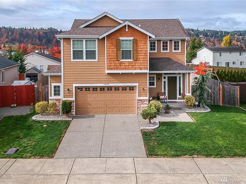Delightful 2-story home on large fenced lot in Village Green! You'll love the vaulted ceilings, open floorplan, and views of Mt Rainier & surrounding hills. Abundant natural light throughout. Turnkey home has spacious kitchen with island/eating bar, pantry, and sliding-door access to backyard & patio. Upstairs master with 5-piece bath and walk-in closet. Roomy garage. Community has walking trails, parks, sport courts, and is near schools & amenities. Pre-inspected, 1-yr warranty included!