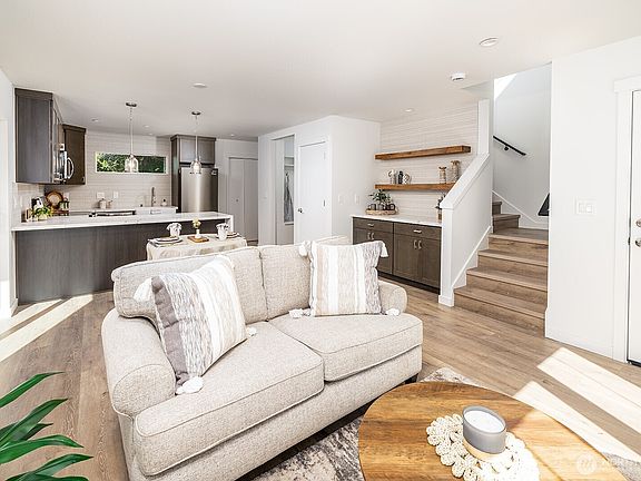 A thoughtfully designed home that exudes modern elegance and effortless living. The main floor features a refined living room with custom built-ins, floating shelves with tile accents, and a chef-inspired kitchen with designer tile and an oversized bar for entertaining. A powder room, built-in mudroom bench, and bonus storage add sophistication and function. Upstairs, the primary suite impresses with dual closets and a spa-like ensuite, joined by a second bedroom and full bath—both with heated floors, exquisite tilework, and custom cabinetry. Complete with a one-car garage, EV charger, and Built Green certification, all set in a serene neighborhood surrounded by evergreens—this residence is truly an exceptional and smart place to call home.