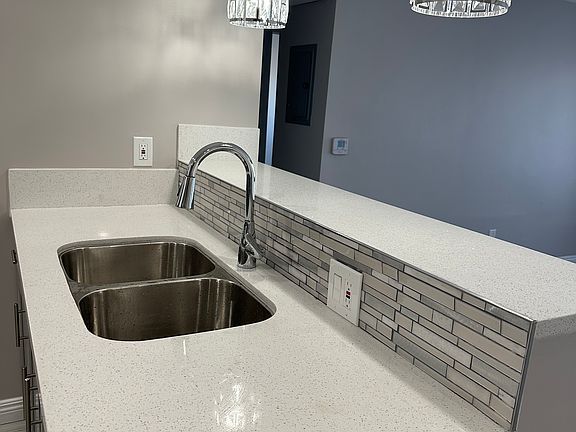 Granite countertops, unique lighting fixtures, and recessed lighting throughout the unit.