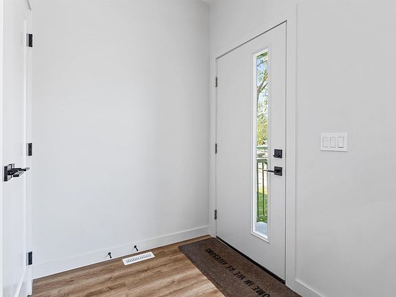 Airy open-concept layoutSleek electric fireplaceChef-inspired kitchenBlack stainless steel appliancesOversized islandQuartz countersSoft-close cabinetry