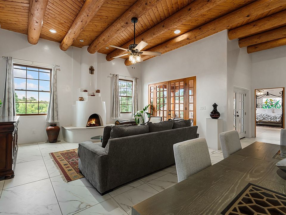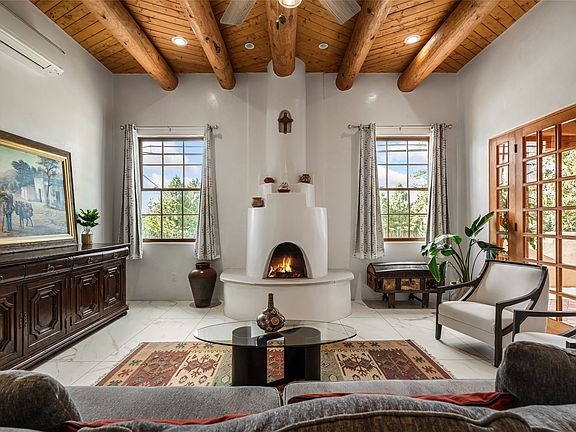 Elegant Eastside Living on Upper Canyon Road - Set in a premier Eastside location across from the tree-lined Santa Fe River Park, this beautifully designed and built 4-bedroom, 4.5-bathroom estate blends timeless Southwestern charm with modern luxury. Offering approximately 3,800 square feet on a 0.45-acre lot, the property includes a 3BD/3BA main residence and a 1BD/1BA guest suite, thoughtfully designed for comfort, privacy, and style. Inside, clean architectural lines meet regional authenticity with vigas, corbels, and nichos, complemented by diamond-finish plaster walls, wide porcelain tile, and rich wood flooring. The open-concept layout flows seamlessly through the home, anchored by a chef’s kitchen with custom cabinetry, stainless steel appliances, a farmhouse sink, and an expansive marble center island. The living and dining spaces feature vaulted ceilings, art-worthy wall space, and abundant natural light. A serene primary suite offers a walk-in closet, artisan stained-glass windows, and a spa-like bath with soaking tub and glass-enclosed shower. Radiant heat and mini-split systems (with heat and a/c) throughout ensure year-round comfort. The landscaped grounds invite outdoor living with portals and patios ideal for entertaining or quiet reflection. A privacy wall encloses the property, and an oversized one-car garage offers additional storage. Located near the historic Cristo Rey Church—a landmark by architect John Gaw Meem—this property captures the essence of Santa Fe living: elegant, rooted in history, and surrounded by natural beauty.