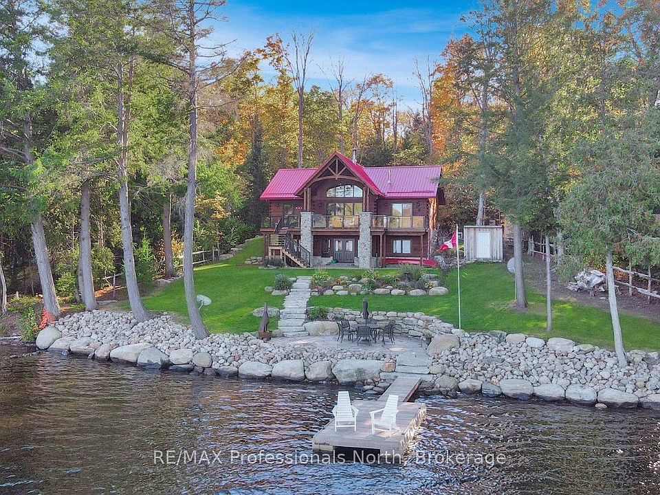 Welcome to family living on beautiful Jordan Lake in Highland Grove. This professionally landscaped Confederation log home sits on just under a half acre with 120 feet of sandy shoreline, offering both a shallow entry and deep, clean water perfect for swimming and summer fun. The property showcases true pride of ownership inside and out. The home offers over 2,400 sq. ft. of living space with a timber frame interior, vaulted ceilings, and an impressive stone propane fireplace as the centerpiece of the open-concept main floor. Families will appreciate the spacious primary suite on the main level, complete with a 4-piece ensuite, walk-in closet, and a walkout to the expansive 700 sq. ft. deck overlooking the lake. Additional highlights include custom live edge stairs with an iron railing, adding a unique touch of craftsmanship to the interior. The lower level is designed with family in mind, featuring a bright walkout rec room with a stone wood-burning fireplace, two additional bedrooms, a 3-piece bath, and a convenient laundry room - plenty of space for kids, guests, or extended family. With 3 bedrooms, 2.5 baths, and a backup generator, this four-season home offers comfort and peace of mind year-round. Located only 35 minutes from the village of Haliburton, you'll have access to schools, shops, restaurants, health services, arts and culture, and a welcoming community. A professionally landscaped, meticulously cared-for lakefront property like this is ready for its next family to enjoy for years to come.