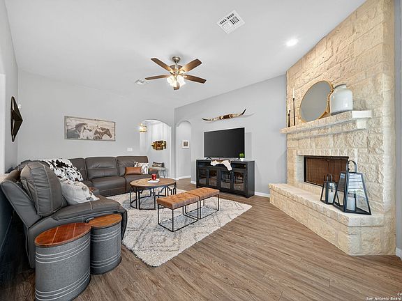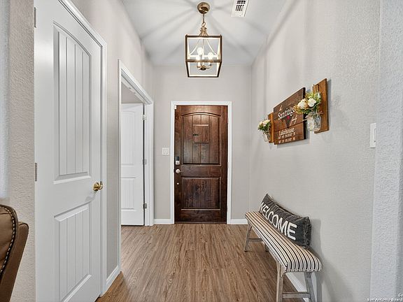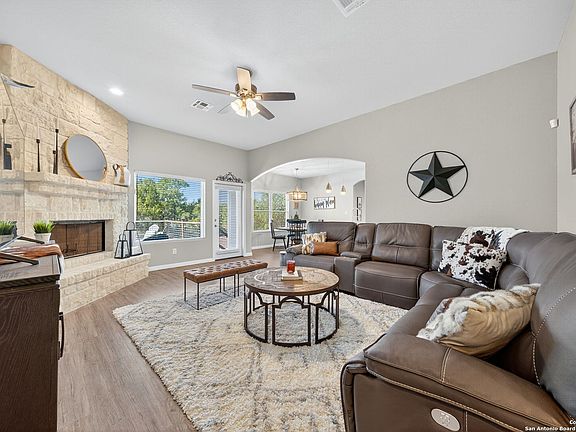 Immaculate Modern Lake Home Near Canyon Lake. Welcome to your dream retreat just minutes from the sparkling waters of Canyon Lake! This stunning single-story home, built just five years ago and lightly occupied, offers the perfect blend of modern comfort and timeless Hill Country charm. Step inside to an open-concept floor plan designed for easy living and effortless entertaining. The gorgeous kitchen features sleek finishes, generous counter space, and flows seamlessly into the spacious living area highlighted by a beautiful stone, wood-burning fireplace. A versatile flex room provides endless possibilities-ideal for a home office, fourth bedroom, or creative space to suit your needs. Throughout the home, you'll find upgraded flooring and no carpet, adding both style and practicality. Outside, enjoy the best of Texas living with a covered patio and an expansive deck, perfect for relaxing or entertaining guests. The oversized two-car garage features epoxy flooring for a clean, polished look, while the xeriscaped yard offers low-maintenance beauty year-round. This property comes move-in ready, with the refrigerator, washer, dryer, and all furniture available for sale-making it easy to start enjoying lake life right away. Don't miss this exceptional opportunity to own a nearly new home in a highly desirable location near Canyon Lake. Schedule your private showing today and experience lake living at its finest!