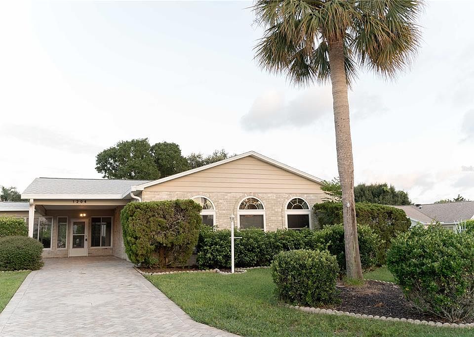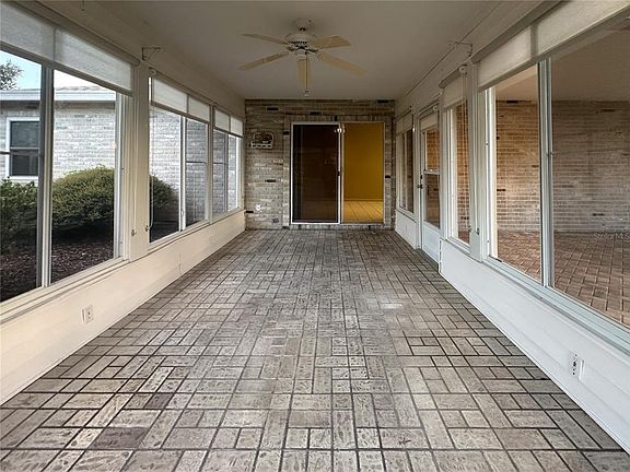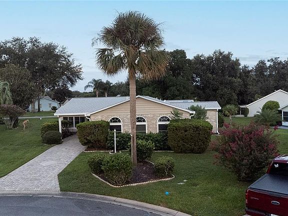 Welcome home to this site-built brick / concrete home nestled in the Village of Del Mar, close proximity to Spanish Springs and Lake-Sumter Landing. AMAZING NEW LOWER PRICE !! This uniquely designed cul-de-sac home has space for all your entertaining and activities with almost 2200 square feet of living space and an additional enclosed lanai and several outdoor areas to enjoy. This home has plenty of storage including several storage closets and pantry in the kitchen. A central cooking station highlights the kitchen. Enjoy music and radio on the surround sound stereo system. A wet bar adjacent to the dining room allows for great entertaining spot - right next to the enclosed lanai to enjoy the outdoor space. This lot is oversized ( over 1/4 acre) and has plenty of room to add on or enhance with a pool/birdcage. The huge primary bedroom has a retreat-style entry so you have your own private TV/sitting/crafting space along with 3 closets - one being equipped with a built-in desk system. Skylights adorn the home providing lots of natural light. The second bedroom has a large walk-in closet and its bathroom is ensuite, yet accessible to your guests as well. Laundry room is separate and has Maytag washer & dryer with tons of storage and workshop space and also an outdoor-style utility sink. You'll love the newer tankless water heater for efficiency. Wood-look laminate flooring and tile in the kitchen and baths along with a neutral color palette provide lots of opportunities to make this special home your own. NO BOND. Roof replaced in 2021. HVAC 2020. This location is 5-10 minutes close to Spanish Springs and Lake-Sumter Landing town centers - and minutes from numerous shopping, dining and health care opportunities.