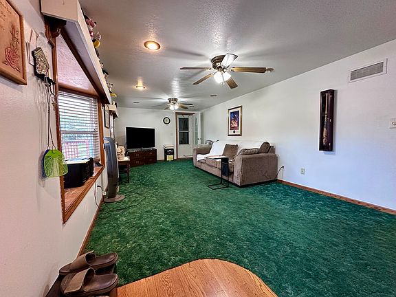 Nice sized one bedroom ranch home! Enter the front door through the 8x14 front deck with new deck boards and posts. There is a spacious living room and a dining room area as you enter the front door. The kitchen is located off the living room and has nice hardwood cabinets and plenty of cabinet and counter space. Appliances will stay! Off the kitchen is a main floor living room with a washer and dryer. The one bedroom has a 6x15 room off the back which can be used as a nursery, walk in closet, second bedroom, office, etc! The main floor also has a full bathroom. This home has a partial basement perfect for storage. There is a two car attached garage and a driveway for additional parking. The roof was replaced on 7/6/2023 and the gutters have gutter guards! Home is located in a convenient location near schools, gas stations, shopping.