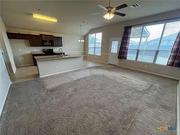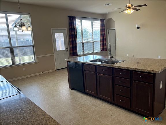 has sink, dishwasher, and cabinets. Plenty of serving space for entertaining on the island's countertop. The split floor plan has a 14'3" x 13'4" Master Bedroom located on back side of home. Master Bath has a double vanity, garden tub with shower, separate toilet room, and a large walk-in closet. There is a hallway near entry of home that provides access to a hall bathroom, and two bedrooms. Another plus to this home is there are many electrical outlets throughout the home. Adjacent to the kitchen is a pantry and laundry room is across from it. These are next to entrance from 22'11" x 17' 11" garage. The back patio has an awning on it and there is a small awning attached to the storage building which may be used by adults, children, or pet(s). Gutters are across the front garage and along front entry and across back of home. The flag pole will remain and sellers will leave the American flag that can be seen in pictures if buyer(s) are interested in using it with the flag pole. 1205 Abbey Ridge is located off Nugent with easy access to the Loop, Highway 36, and I-35. Note: All measurements are estimates and should be confirmed by buyer(s). Information Deemed Reliable But Not Guaranteed