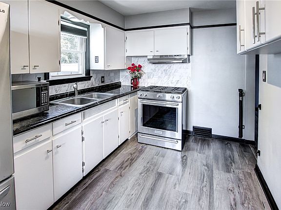 Welcome home to this beautifully updated 2-bedroom ranch in Akron! Move-in ready and thoughtfully improved inside and out, this home offers modern style, practical updates, and cozy spaces you’ll love. The main level features a fresh remodel with premium LifeProof vinyl flooring, new baseboards, doors, windowsills, and ceiling fans, all professionally painted in today’s modern tones. The kitchen shines with updates including a striking backsplash, hardware, and refreshed finishes, while the bright living room makes a perfect gathering space. Downstairs, the full basement was completely remodeled in 2023 with brand new steps, stylish flooring, and an electric fireplace for a warm, inviting retreat. The bathroom was fully renovated in 2024. Outside, curb appeal abounds with new front porch and side steps (2025) and a complete landscaping transformation with sod, flower beds, and a fully redone backyard—ideal for relaxing or entertaining. Plus a fully fenced in yard provides privacy and seurity. Major updates provide peace of mind, including front windows (2019) and a roof (2013). This charming ranch blends comfort with updates in all the right places, offering a move-in ready lifestyle at a great price. Don’t miss your chance to call it home!