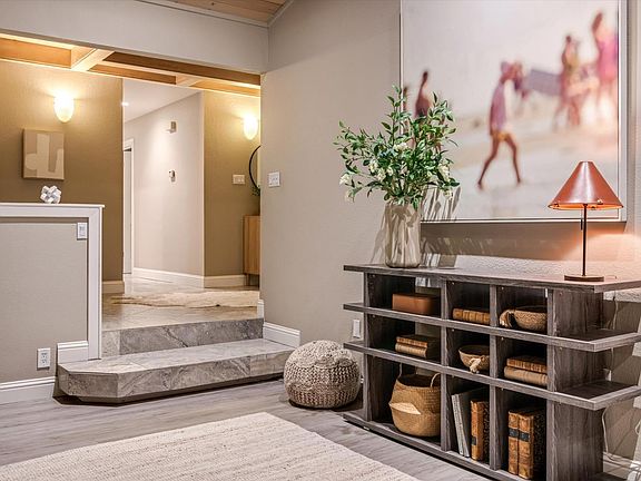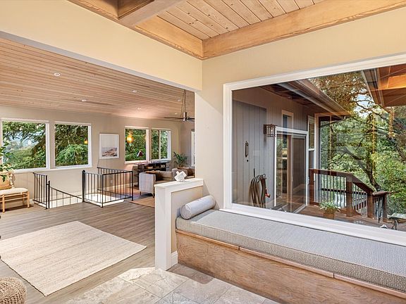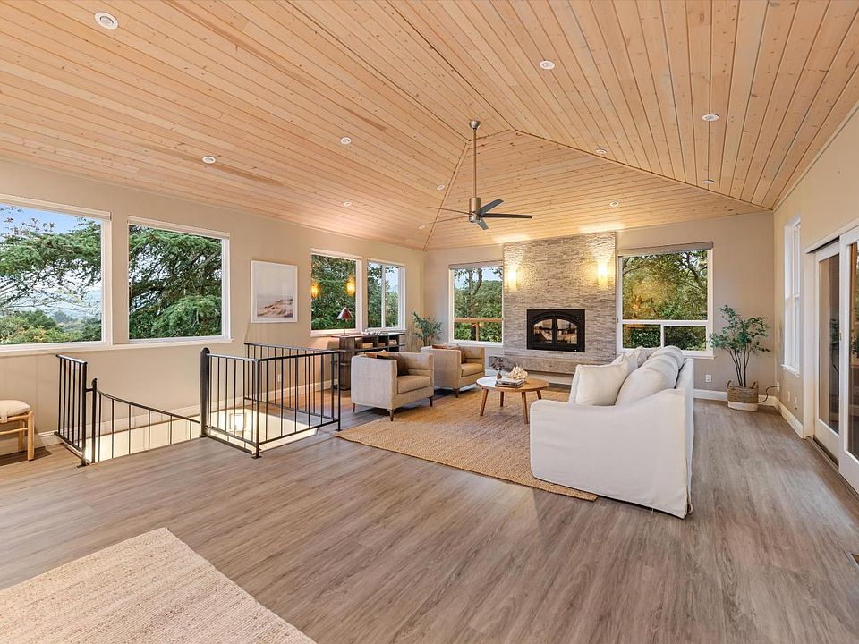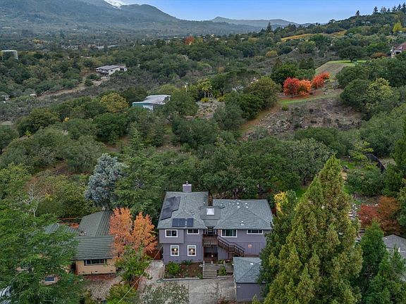 Harmoniously set on .26 acres in Sonoma Valley's oak-studded hills, this meticulously updated 2,930 sq ft retreat offers privacy with sweeping Sonoma Mountain views. The reverse floor plan maximizes vistas from main living spaces, featuring a remodeled kitchen with granite counters, wood cabinetry, travertine flooring, and stainless steel appliances. Step outside to expansive hardwood decking amongst the treetopsan elevated stage for memorable gatherings. Four bedrooms and four baths provide spacious accommodations, each with unique views. The lower level features an additional living area and bar, creating a speakeasy-style entertaining area, plus a separate cedar sauna. Recent updates include newer roof, solar panels, HVAC, marble fireplace, custom kitchen and baths, ipe decking, and tongue-and-groove wood ceilings. The thoughtful layout offers potential for a private lower-level suite. A detached two-car garage with space for storage. Located in a walkable area close to renowned restaurants, wineries, farmers market, and wonderful neighbors.