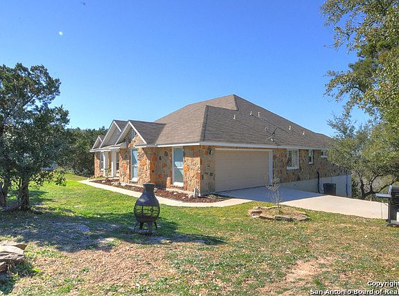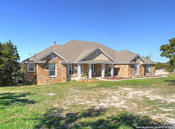 5 bedroom, 3.5 bath home on a corner lot of 7+ acres on a hillside overlooking a valley below. Master suite with ceiling fan, walk in closet, dual vanities, recently updated shower (2017) and garden tub. Open floor plan for carpeted main living area with rock fireplace and connecting tiled breakfast nook with large windows and covered back porch. Separate tiled formal dining room and carpeted game room. 3 regular bedrooms and 1 suite with a full bath. Kitchen has granite countertops with reverse osmosis filter, garbage disposal, dual ovens, electric cooktop with overhead microwave, service island and pantry. Separate laundry room with utility sink water and drain capped. Attached 2 car garage with an additional detached 2 car garage. 50-gallon water heater updated in 2018 and water softener. Well house with storage tank. Aerobic septic system with liquid bleach input. Fenced area of approximately 3 acres. 5-foot chain link across road frontage. 4-foot range fence along back.