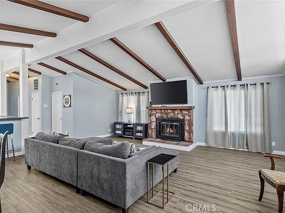 A spacious two-bedroom, two-bathroom double-wide mobile home located in a well-maintained and serene park in San Dimas. This residence features an open floor plan with recessed lighting, wood laminate flooring, high-beam ceilings, and a cozy fireplace. The updated kitchen is perfect for culinary enthusiasts. The large bedrooms feature ample closet space, providing plenty of storage. Numerous windows, including several skylights, fill the home with natural sunlight. The home is painted with soft colors and accented with white trim, creating a welcoming atmosphere. An indoor laundry room adds to the convenience of this home. The park offers an array of amenities, including two swimming pools, a Jacuzzi, a recreation room, a basketball court, a pool table, and a clubhouse. Conveniently situated close to hospitals, schools, shopping centers, dining options, and major freeways, this home provides both comfort and accessibility.