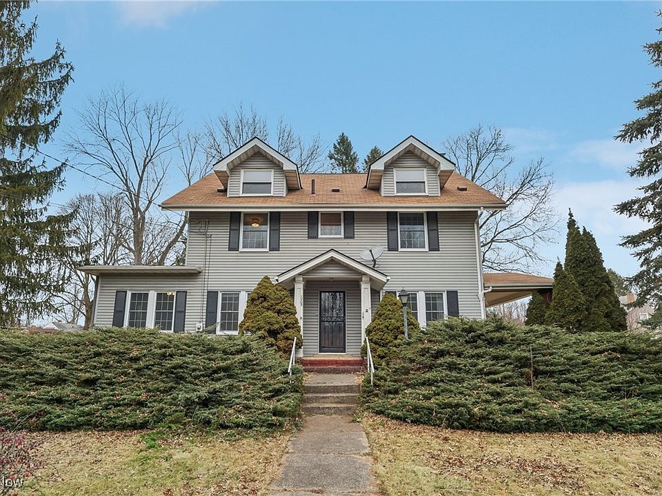 Welcome home to 1205 Eastwood in desirable Goodyear Heights neighborhood of Akron, OH. This home provides space galore, condition/updates and location convenient to Akron and beyond. A charming classic colonial the home sits beautifully elevated offering attractive landscaping and curb appeal. As you arrive you’ll be drawn in by the gabled roof line, the front portico entry & foyer and updated side porch with inviting metal balusters. Perfect for arriving guests or relaxing visits. Large, this 3 story home features 2,393 square feet above grade. Entries include front foyer, side porch, and driveway (into kitchen area). The first highlight is the reconfigured updated kitchen with island, cabinets, LVT flooring, pantry, and half bath. Current owner also provided more opening to the generous dining room. Off the dining room is a multi-purpose room, perfect spot for study/office or 1st floor bedroom as your need may be. Inviting central hall and stairway from the front foyer joins the large living room (featuring French doorw, attractive fireplace and access to large redone side porch) and dining room. The second floor offers a large landing hallway, 3 large bedrooms, and redone full bath. And the third floor is a great value to this home with two attractive rooms, one with charming exposed brick. Add in paved drives, double lot (1/3 acre) with a large tandem 4 car garage and shed. Updates: kitchen, bathroom, windows, chimney, water lines, electric, bedroom reno, blinds; with newer boiler (2012 new, serviced 2019), vinyl siding, roof. And if you want clean & safe, see attached environment quality reports - these owners have tested and tended to it all. Don’t wait and miss what seldom comes to market (space, updates, great indoor enviro, value). Welcome home!