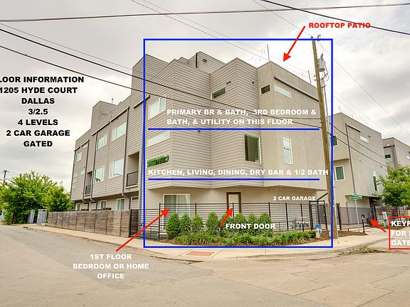Modern townhome just minutes from downtown Dallas in the Cedars. Unobstructed views of the skyline from the rooftop patio are amazing & perfect for entertaining. BBQ pit included! 3 BR-2.5 BA in a gated complex with 2 car garage. Living, dining & kitchen floor is open & has windows all around that let in the natural light. Stained wood flooring & clean modern finishes adorn the entire home. Kitchen has gas cooking & built in appliances. Fridge, washer & dryer INCLUDED. DART Station is a tenth of a mile away. Bedroom details: 1 bedroom (or home office) on 1st floor, Main Bedroom & 3rd bedroom on 3rd floor with two bathrooms. Home has smart switch capabilities & smart door locks. Security alarm available at tenant expense. Pets allowed on case by case basis. Approval can take up to a week. Online Application Only-need last 2 paychecks (or bank stmt if self employed), ID, Photo of Pet, full application, background check, credit check. $85 per person over 18. *Some rooms virtually staged*