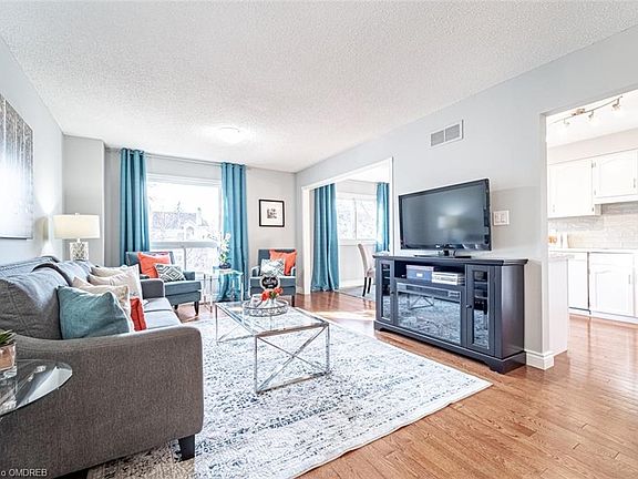 Stunning 3 bed, 2.5 bath home, walking distance to the lake and downtown Burlington! 1646 sqft! This beautiful property offers a unique open concept layout with an oversized foyer, comfortable living & family rooms (above grade) and a main floor laundry/mudroom with access to the garage. Freshly painted in neutral tones and real gleaming hardwood floors throughout, this home enjoys the morning sun at the front and the afternoon sun in the living rooms in the evening. The updated kitchen has quartz countertops, ceramic backsplash, and tons of cabinet and counter space and a large area for a dining table and hutch. The upper level of the home has 2 generous bedrooms and a newly renovated main bath. The Master bedroom features an ensuite, walk in closet and charming walkout to a balcony. On the lower level you will find the 3rd bedroom, a family room with a fireplace and a walkout to a private deck with lush greenery behind. Pride of ownership is evident in this small enclave of well maintained townhomes with LOW condo fees.