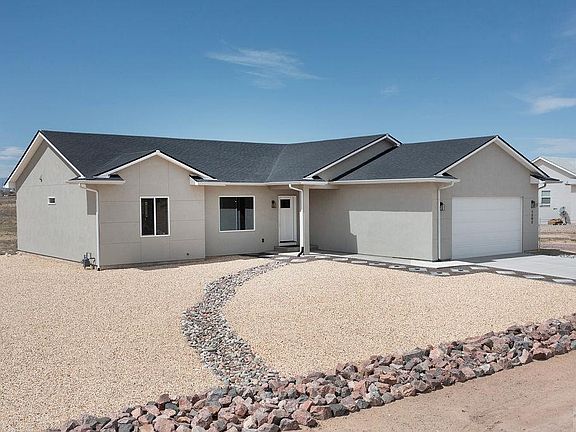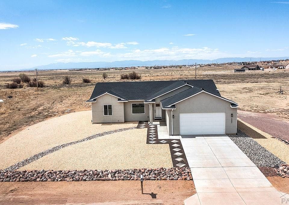 This contemporary newer home backs to a large equestrian easement & then to the Walker Ranch conservation easement. Great mountain views of Greenhorn and Spanish Peaks will always be preserved, plus you can enjoy nice evening light views from Pueblo in the distance. Elegant like new (2023 built) home with everything done for you.... new contemporary light fixtures, plantation blinds, and attractive yet low maintenance landscaping. Enjoy the gas-fired fireplace off the covered back patio. Vaulted ceiling and many windows accentuate the openness and lightness in this home. Open concept living spaces incorporate a 9 x 5 center island to gather at around the kitchen. It is a black leathered pearl granite finish (matching the rest of the kitchen and bathroom counters). Easy care luxury vinyl plank flooring throughout. 9 foot ceilings in the bedrooms add a spacious feel. 5 piece master bath has a corner slipper tub, walk-in shower, private toilet room with heated seat and water on bidet toilet and a well-organized master closet with lots of wood shelving. Easy to hop onto I-25 from this location, yet it feels off the beaten path on a cul-de-sac location. Extra deep garage with 8 foot tall doors accomodates larger vehicles. An RV parking area has been developed beside the garage. Everything gleams in this home, even the low E windows, so just move in and enjoy it!!!! Synthetic stucco sheds water and resists cracking. ... Don't miss this perfect house-just move in!