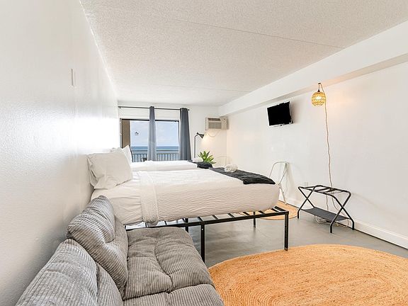 Unwind in this meticulously updated condo, a perfect blend of Scandinavian simplicity and coastal charm. Step into a bright, airy space defined by crisp white walls and an open, modern design. The all-new kitchen is both stylish and functional, featuring a sleek burner, a new mini-fridge, and rustic wooden shelves. Relax in the living area on the brand-new grey sofa and catch your favorite shows on the wall-mounted TV. The warm glow of the Scandinavian- and coastal-inspired light fixtures enhances the modern, serene atmosphere. The bedroom area is a cozy haven with new bed frames, fresh blankets, and wooden shelving for a clean, organized feel. The painted concrete floors add a touch of industrial cool, softened by two new jute rugs. Outside, your private balcony offers a peaceful retreat, furnished with a stylish metal dining set perfect for morning coffee or evening drinks. Practical features like a new clothes-hanging area and luggage holder near the entrance make it a breeze to move in or get ready for a trip. This condo is a turnkey gem, a perfect investment or personal escape where every detail has been thoughtfully considered for you. Don't delay and schedule your showing today!