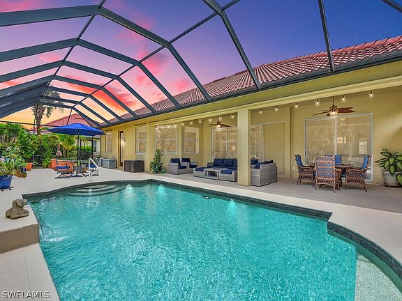 NOT IN A FLOOD ZONE! This single family POOL home w/ a 3 CAR GARAGE features a BRAND NEW TILE ROOF (2024), NEW dishwasher (2023), NEW A/C (2022), NEW exterior paint (2021), freshly painted interior & NEW fridge (2019). In addition this home has stunning tropical landscaping w/ peaceful outdoor living space, beautiful pool w/ a water fountain, OVERSIZED pool deck w/ lounging space, and covered sitting area. Luxury features throughout the interior- great room design, tile flooring, volume ceiling w/ crown molding, disappearing sliders, circular kitchen design w/ island & tv, formal dining area, den/home office, split bedroom floor plan & a large dog run on side of the home. Hidden Links a gated community situated in the highly desired Gateway area. The Club @ Gateway offers a country club setting w/ social & golf memberships available. Very convenient location- close to I-75 and to the Spring Training Fields of the Boston Red Sox & the Minnesota Twins, short drive to the beaches that line the Gulf of Mexico, and surrounded by tons of entertainment, dining, & shopping options!